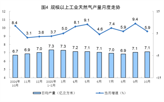 天然氣生產(chǎn)增速放緩。10月份,規(guī)上工業(yè)天然氣產(chǎn)量221億立方米,同比增長(zhǎng)5.9%,增速比9月份放緩3.5個(gè)百分點(diǎn);日均產(chǎn)量7.1億立方米。1—10月份,規(guī)上工業(yè)天然氣產(chǎn)量2170億立方米,同比增長(zhǎng)6.3%。