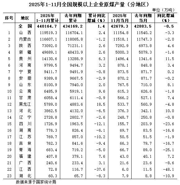 1月—11月全國規(guī)模以上分省區(qū)原煤產(chǎn)量數(shù)據(jù)發(fā)布