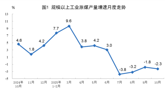 原煤生產(chǎn)保持較高水平。10月份,規(guī)上工業(yè)原煤產(chǎn)量4.1億噸,同比下降2.3%,連續(xù)四個(gè)月同比下降。1—10月份,規(guī)上工業(yè)原煤產(chǎn)量39.7億噸,同比增長(zhǎng)1.5%,增幅持續(xù)縮小。