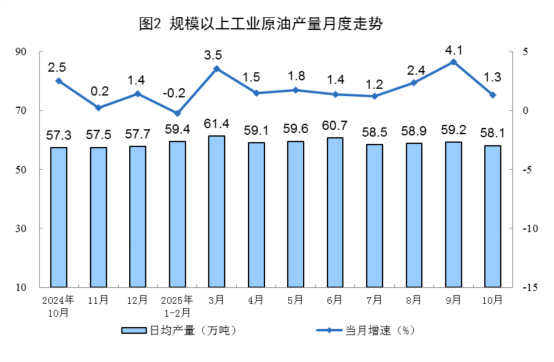 原油生產(chǎn)保持增長(zhǎng)。10月份,規(guī)上工業(yè)原油產(chǎn)量1800萬(wàn)噸,同比增長(zhǎng)1.3%,增速比9月份放緩2.8個(gè)百分點(diǎn);日均產(chǎn)量58.1萬(wàn)噸。1—10月份,規(guī)上工業(yè)原油產(chǎn)量18064萬(wàn)噸,同比增長(zhǎng)1.7%。